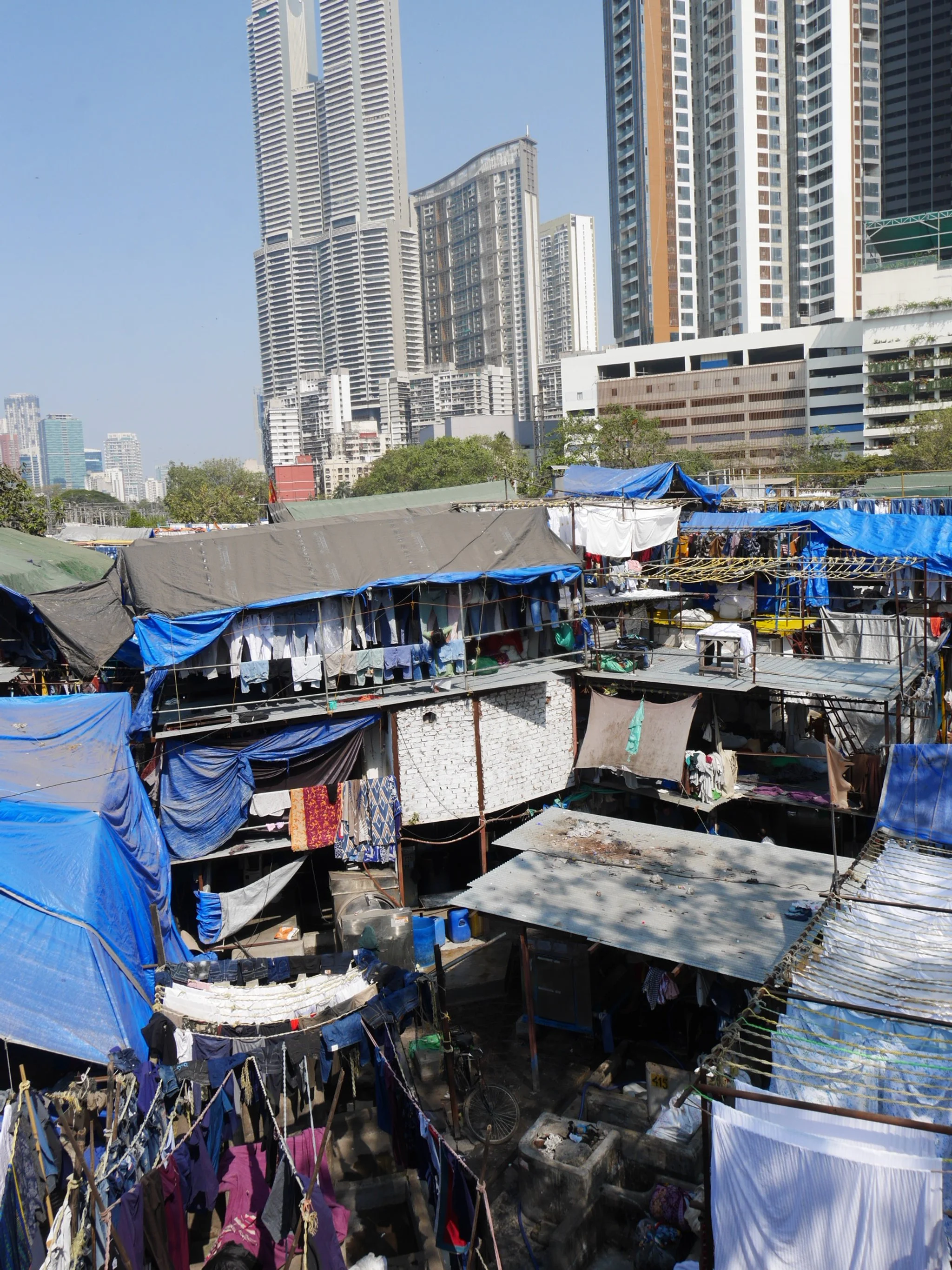 カーストが一番下の方々が病院やレストランの洗濯物を洗濯する様子がわかるちょっとした有名スポット。その後ろでは、高層ビルが立ち並び、インドの格差が伺える一枚。